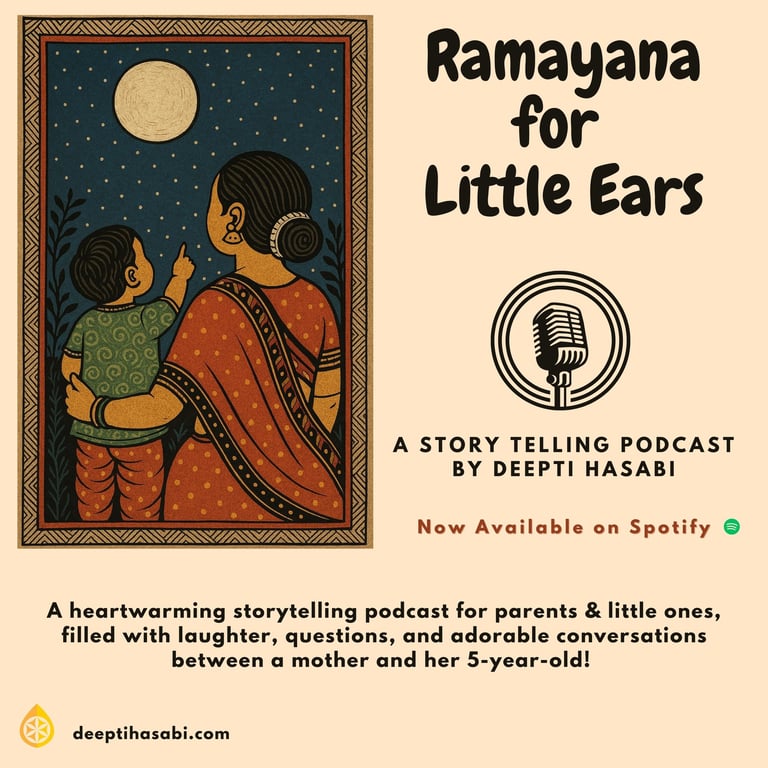 A storytelling podcast like no other! 🏹💛 Join me and my little one (when he was 5 years old) as we journey through the Ramayana—filled with giggles, questions, and heartwarming conversations. 🎙️✨